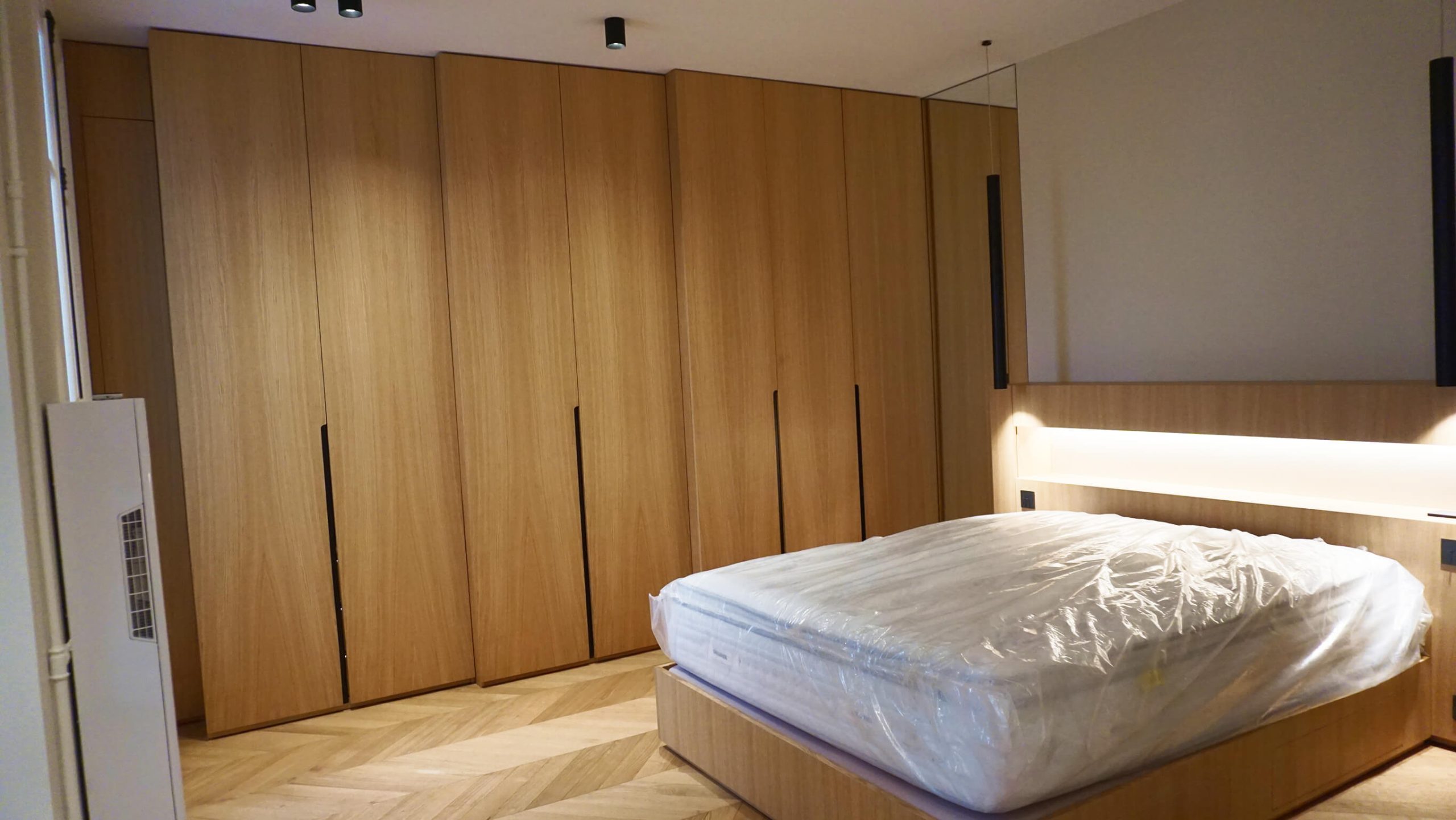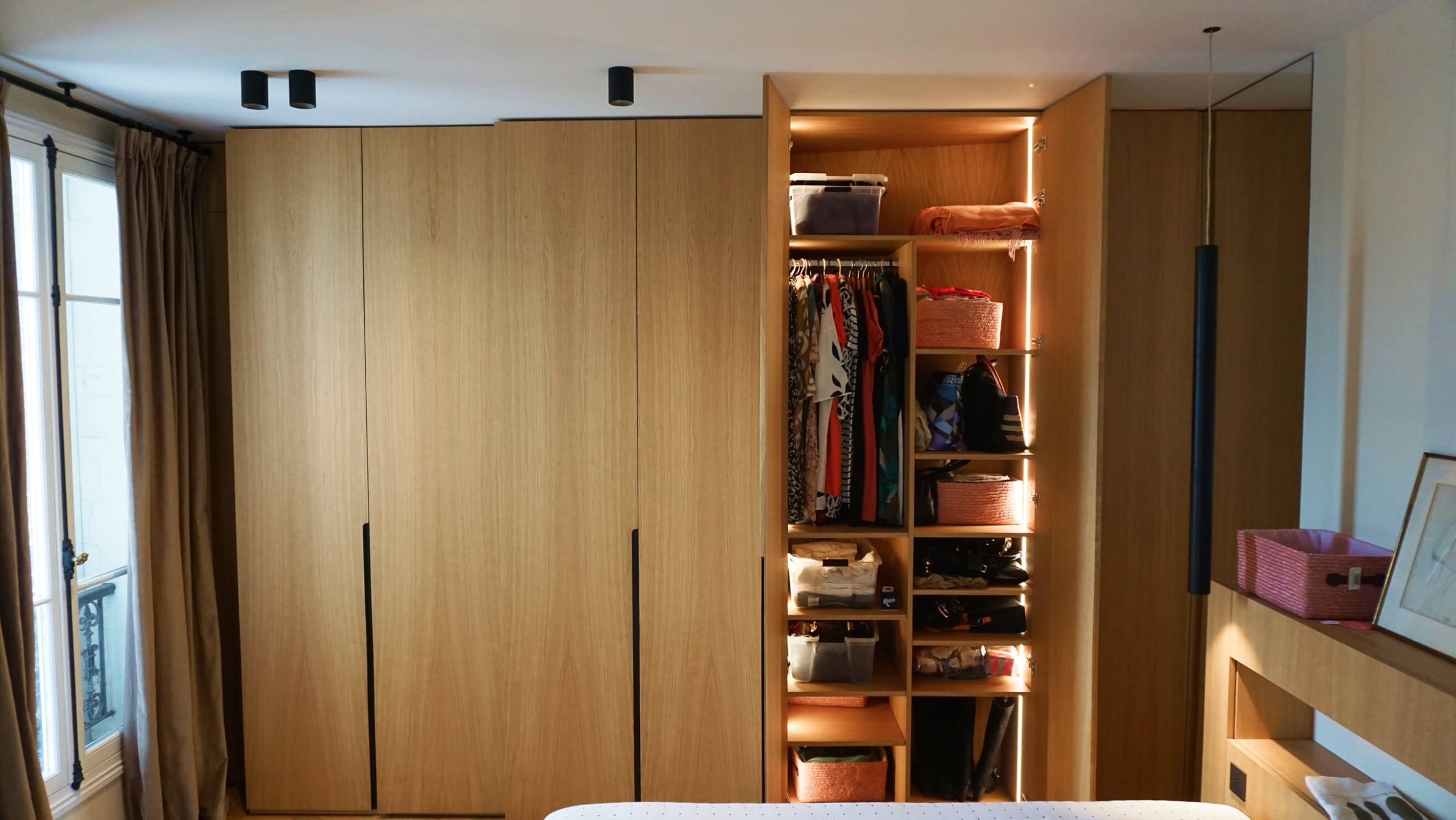Roupeiro com múltiplas gavetas e prateleiras / Iluminação interior / Puxadores discretos